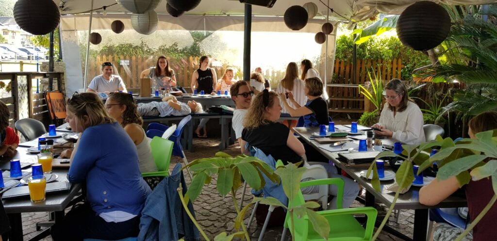 Dus trakteren we onszelf nog maar eens op een ijskoffie. En wordt Fred in 3 minuten tijd omgetoverd in een rokende en aan drank verslaafd skelet, als de docent een kort telefoontje pleegt. We zijn tussen de 25-58 jaar oud, maar gedragen ons soms net als pubers. Lekker hoor om gewoon vijf maanden serieus een opleiding te volgen en ook veel met elkaar te lachen.