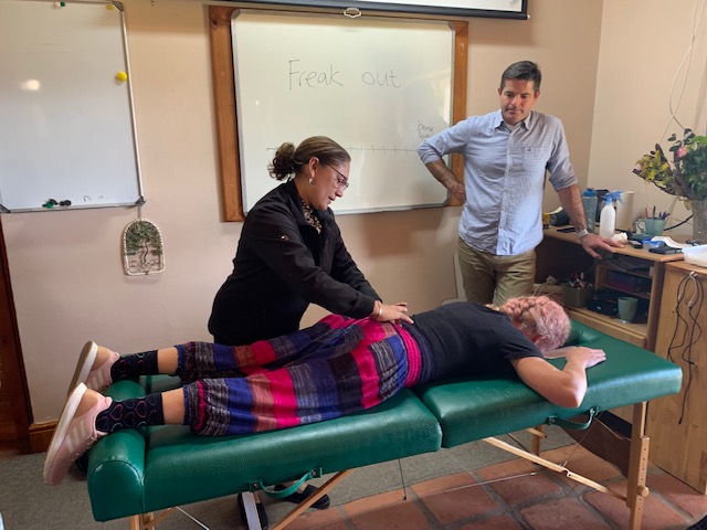 We hadden maandag een dikke syllabus ontvangen en daar gingen we dinsdag mee aan de slag. In de ochtend startten we eerst met een fijne gedachte, richtlijnen van BSR, anatomie, we oefenden met de techniek en we leerden de bot oriëntatiepunten te ontdekken op Fred. Oftewel, waar voel je wat op het lichaam? Als er iets is wat er voor mij duidelijk is, dan is het wel dat deze docenten de aspecten van adaptief onderwijs volgens Stevens heel goed beheersen. De docenten zijn compleet dienstbaar om ons op ons gemak te stellen, ons aan te moedigen, voorzichtig uit te dagen en er is veel humor. Het is een warm bad waar je in terecht komt. Er is aandacht voor ons. Er werd benoemd dat ze het bijzonder vonden dat we ons maandagmorgen zo open en kwetsbaar hadden opgesteld bij het introduceren van onszelf. Dit was een mooi inleidend bruggetjes voor het bekijken van onder andere een grappige en wijze Tedtalk hierover van Brené Brown. Mocht je 20 minuten van je tijd over hebben, klik dan eens op deze link.
