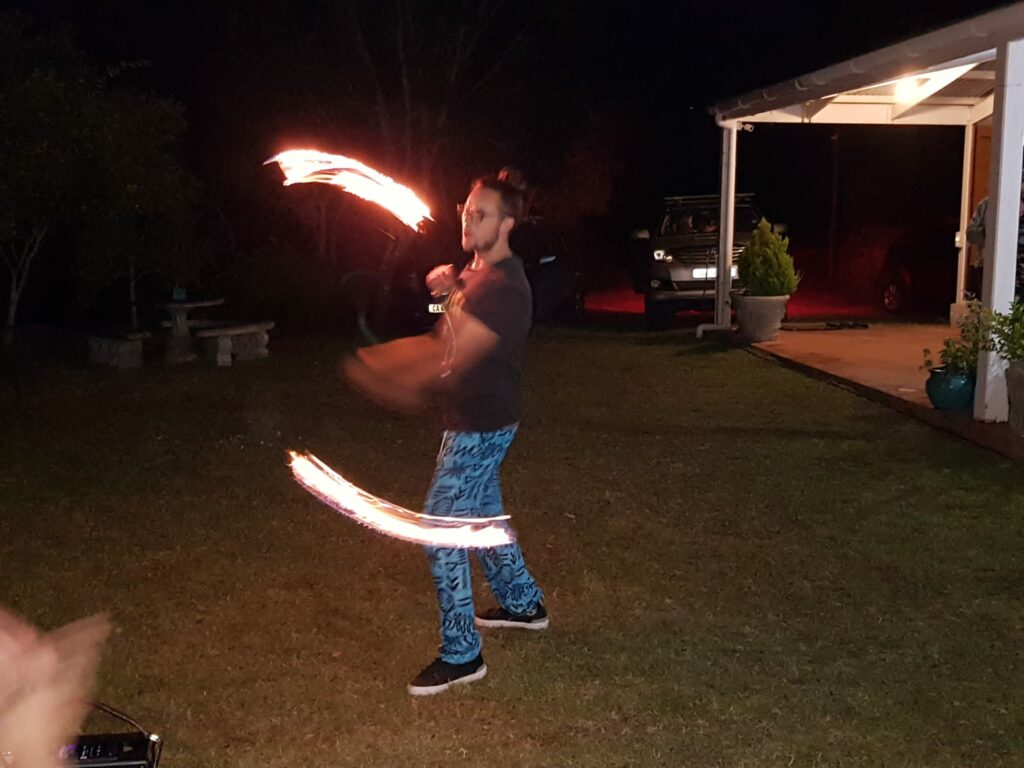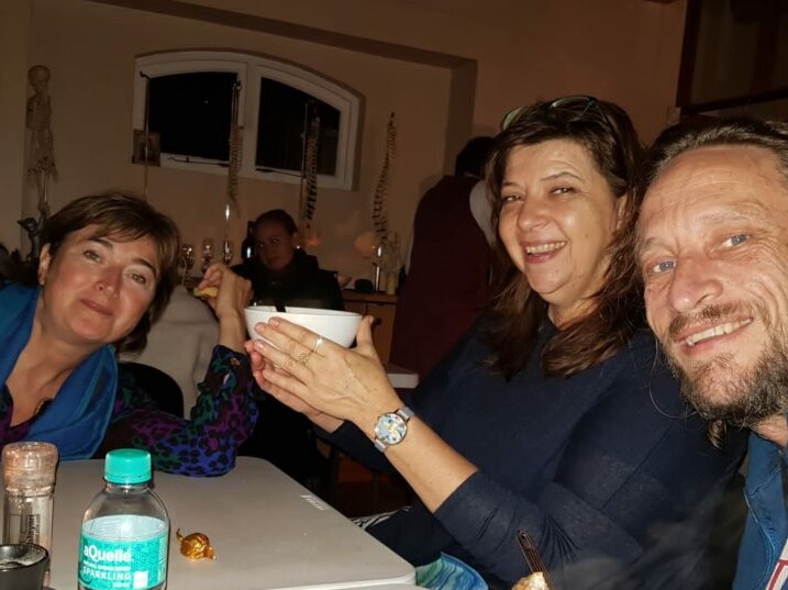 We hebben het geluk dat twee studenten yoga en pilates docent zijn. De liefhebbers sloten vrijdagmiddag af met een Ying Yoga les. Heerlijk in de zon, buiten op een matje terwijl we uitzicht hadden op het meer en de bergen eromheen. Wat een rijkdom om hier te zijn. Die avond brachten we allemaal soep of iets anders lekkers mee naar de akademie. Partners en practitioners waren uitgenodigd en we eindigden de week met een gezellig diner. Evander liet zijn vuurdans kunsten zien. Het was een heerlijke afsluiting van de eerste week.