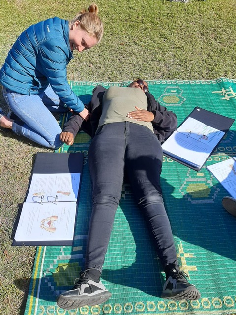 Naast de theorie die we kregen, oefenden we ook dagelijks met de techniek. Bij elkaar voelden we waar de oriëntatiepunten op het lichaam zijn. En omdat iedereen toch een beetje anders aanvoelt, anatomisch gezien, was dat een leuke oefening. We leerden er in ieder geval veel van.