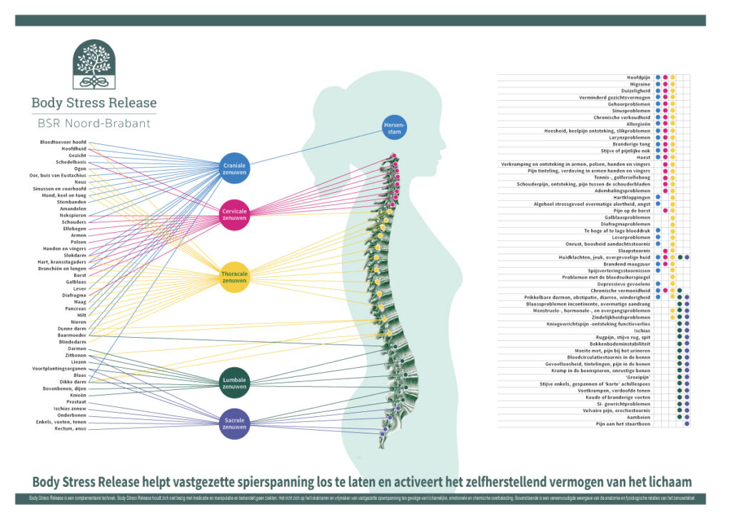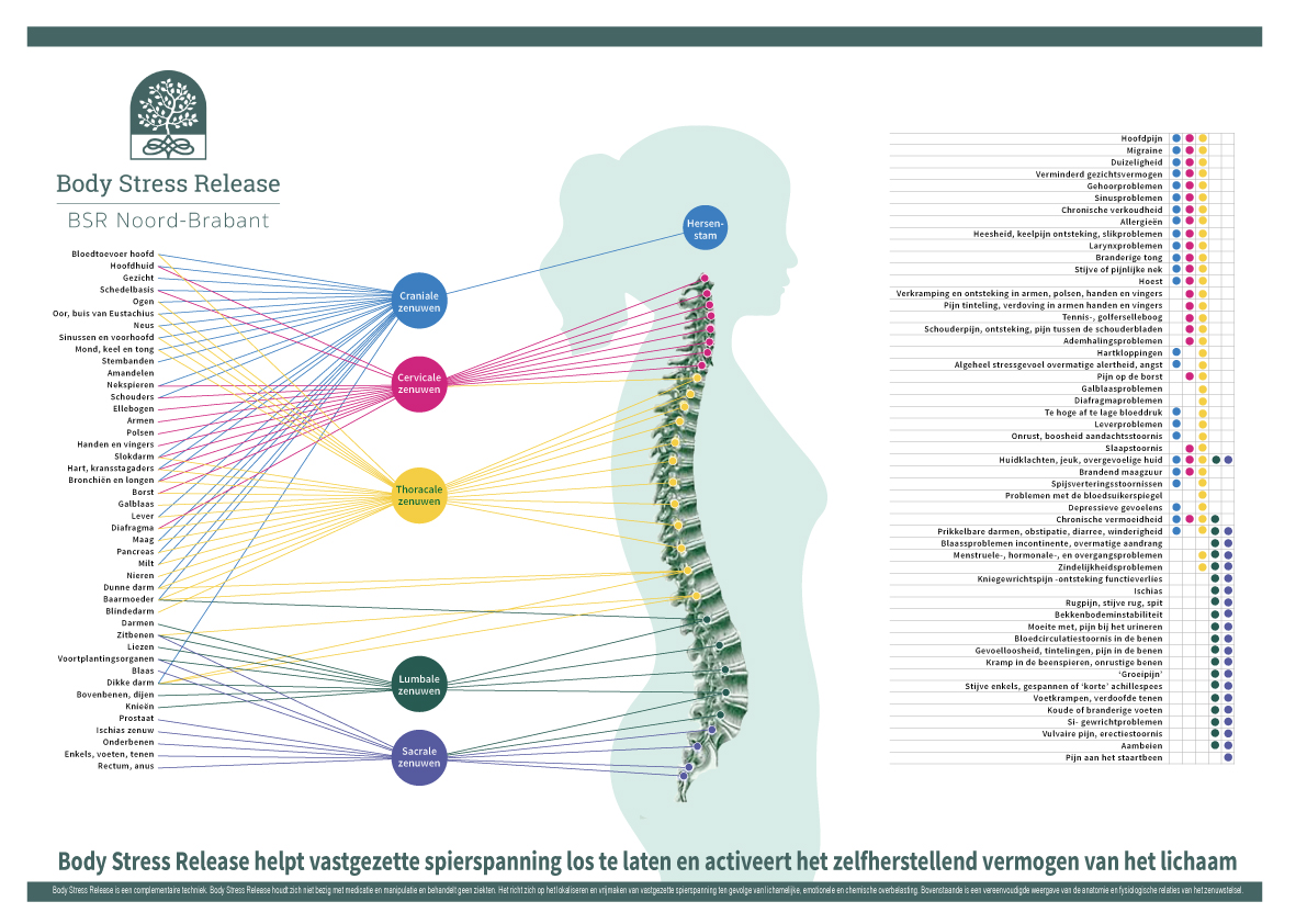 Allergische reacties, astma, baby’s die langdurig en onverklaarbaar huilen, bedplassen, blaasproblemen, body stress, brandend maagzuur, burn-out, carpaal tunnel syndroom, chronische verkoudheid, chronische vermoeidheid, darmkrampen, duizeligheid, fibromyalgie, frozen shoulder, gehoorproblemen, gevoelloze armen, gezichtsvermindering, golfarm, groeipijnen bij kinderen, depressie, hernia, hoofdpijn, hooikoorts, hormonale klachten, huilbaby’s, incontinentie, ischias, krampen of gevoelloosheid in armen of benen, kramp in de kuiten kramp in de voeten, lusteloosheid, maag- en darmklachten, menstruatiepijn, menstruatie – of overgangsklachten, migraine, nekklachten, nekpijn, onrustige benen, oorsuizen, overbelasting, pijnlijke armen, pijn in benen en billen, pijn in heupen, pijnlijke knieën en enkels, pijn tussen de schouderbladen, pijnlijke of stijve rug, RSI, rugklachten, sportblessures, slijtage aan de ruggenwervels, sinusproblemen, spit, stijve nek, tennisarm, tintelende armen, schouderklachten, tintelingen, vaginisme, vruchtbaarheidsproblemen, vermoeidheid, verstoord slaappatroon. whiplashklachten, zwangerschapsklachten e.v.a.